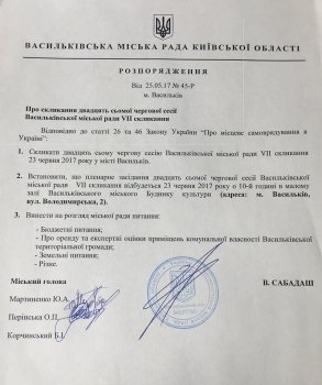 Відповідно до розпорядження міського голови від 25.05.17 №45-Р, двадцять сьома чергова сесія Васильківської міської ради VII скликання відбудеться 23 червня 2017 року.