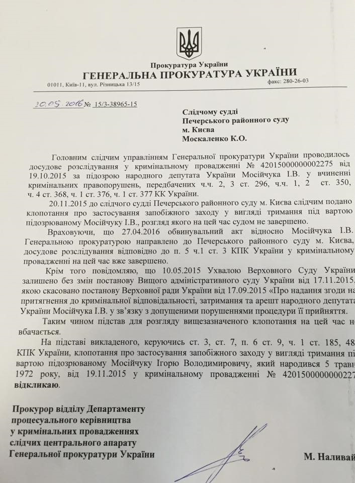 "Генеральна прокуратура заявила, що не бачить доцільності в своєму клопотанні про обрання мені запобіжного заходу у вигляді утримання під вартою і відкликала його. У своїй заяві вони послалися на рішення Вищого адміністративного суду України, яке було схвалене Верховною судом, що постанова Верховної Ради про дозвіл на залучення мене до кримінальної відповідальності, затримання і арешт - є незаконними", - написав Мосійчук.