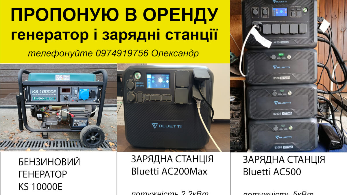 Пропоную в оренду бензиновий генератор та зарядні станції Bluetti різної потужності та з можливістю збільшення ємності батарей.