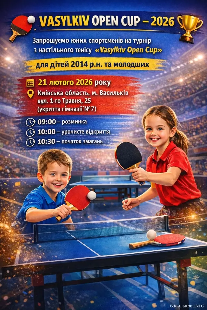 21 лютого 2026 року у місті Васильків відбудеться дитячий турнір з настільного тенісу «Vasylkiv Open Cup – 2026». До участі запрошуються юні спортсмени 2014 року народження та молодші.