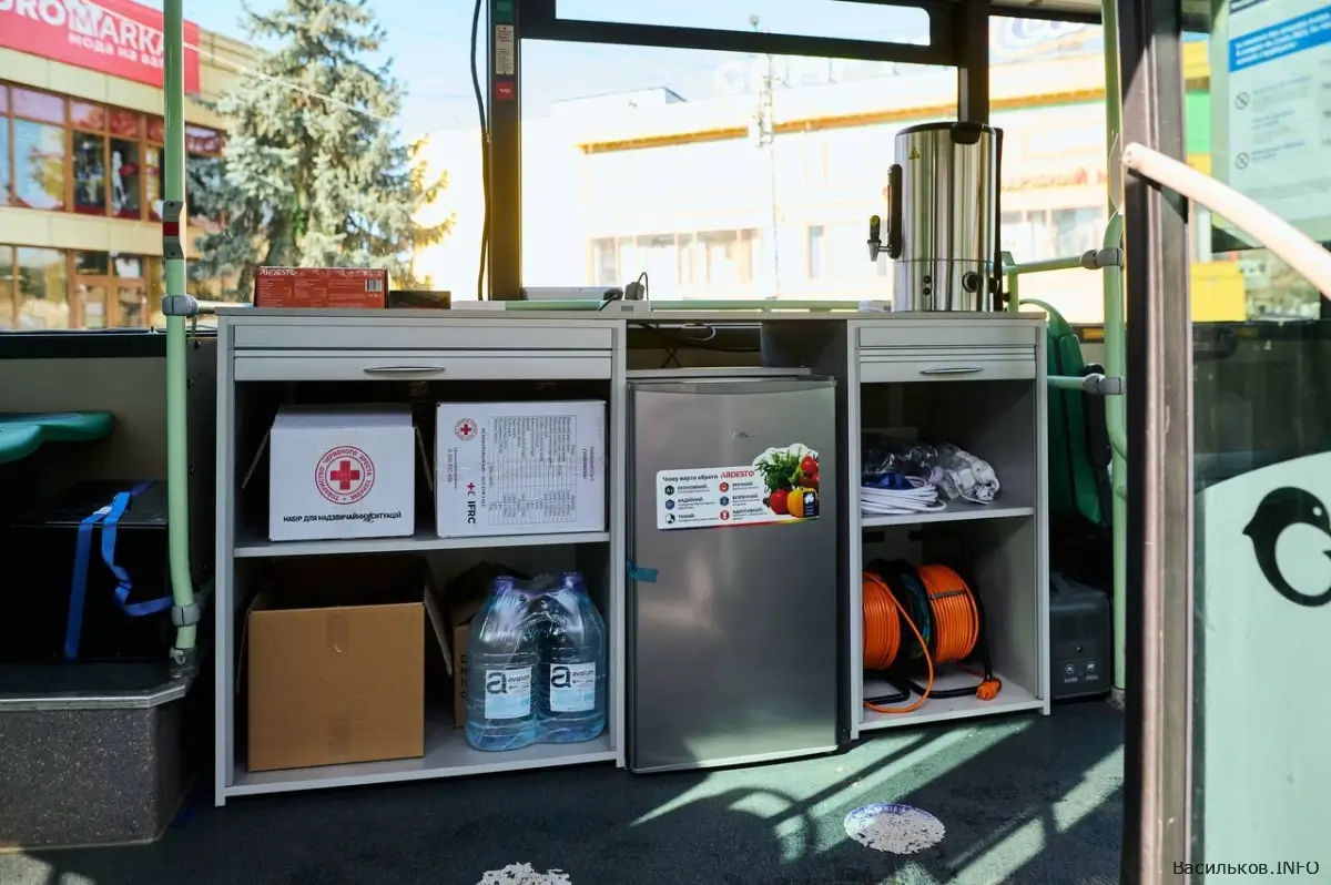 Всередині автобуса створено умови для автономної роботи. Зокрема, він оснащений генератором та системою живлення EcoFlow, супутниковим інтернетом Starlink, обігрівачами, кухонною зоною з холодильником, мікрохвильовою піччю та термопотом. Також передбачено телевізор, подовжувачі, запас продуктів і води, аптечки та теплі ковдри.