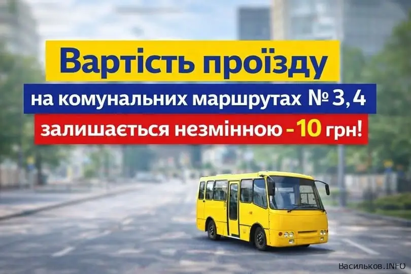 Жителів Васильківської громади поінформували про незмінність вартості проїзду у комунальному транспорті. Йдеться про міські маршрутки №3 (Комісарова гора – Військове містечко) та №4 (Комісарова гора – Масив), де ціна поїздки залишається на рівні 10 гривень.