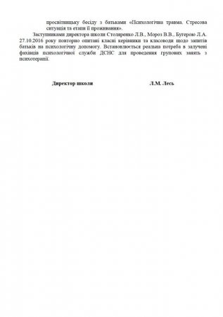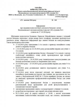Відділ освіти Васильківської міської ради інформує про заходи з надання психологічної допомоги дітям і батькам Васильківської загальноосвітньої школи І-ІІІ ст. №6 станом на 27 жовтня 2016 року.